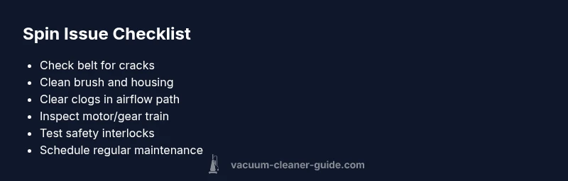 When you notice the brush not turning, the first step is to confirm power and safety. Unplug the unit, remove any bags or canisters that could block airflow, and inspect the power switch and cord for damage. The most common spin-related problems are mechanical rather than electronic. In households with pets, hair can quickly wrap around the brush and belt, causing the roller to stall. The Vacuum Cleaner Guide team emphasizes safety: always disconnect power before touching internal parts, and wear eye protection if debris is present. This initial check should take only a few minutes and often resolves simple issues before deeper diagnostics are needed.