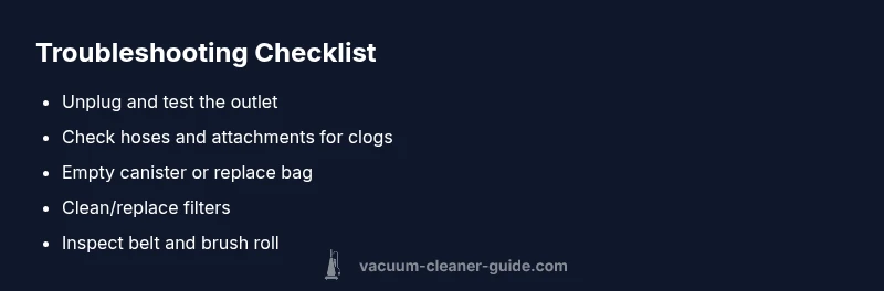 If your vacuum suddenly quits, the instinct is to panic, but most failures fall into a few common categories. According to Vacuum Cleaner Guide, the top culprits include power issues, clogged hoses, full dust canisters, dirty filters, overheated motors, or broken belts. Start with the obvious: ensure the unit is unplugged, the power switch is ON, and the outlet is live with a tester. Next, verify that the power cord isn’t damaged and the plug prongs seat properly. If the unit abruptly stops after a few seconds, overheating protection may have kicked in; let it cool for 20–30 minutes before trying again. A single obstruction in the hose or nozzle can also stop suction; inspect every attachment from head to wand. By understanding common failure modes, you can quickly triage without guessing.
