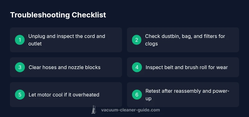 Not all failures require professional service. Start by grouping symptoms: no power on, intermittent power, loss of suction, or unusual noises. No power often points to a power issue (outlet, cord, switch, or fuse). Intermittent power may be a thermal cutout or loose wiring. Loss of suction frequently signals clogs or full dust container. Unusual noises usually indicate belt wear, brush obstruction, or motor bearing wear. For each category, list possible causes and check in that order: first confirm power, then inspect filters and dustbin, followed by checking hoses and nozzle blocks. This approach minimizes risk and makes the next steps clearer for you.